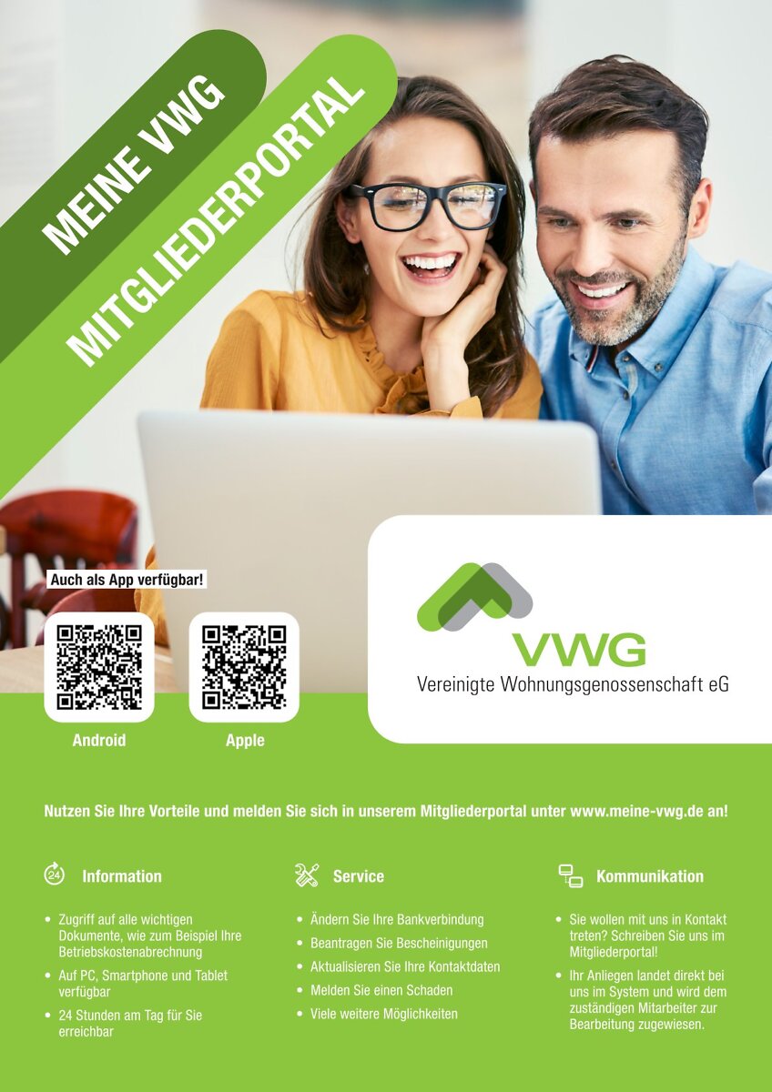 Mit unserem neuen Mitgliederportal „Meine-VWG“ haben Sie alles rund um Ihr Nutzungsverhältnis und die Mitgliedschaft jederzeit griffbereit – einfach, schnell und digital. Ob auf dem Smartphone, Tablet oder am PC: „Meine-VWG“ bringt viele praktische Services direkt zu Ihnen nach Hause.